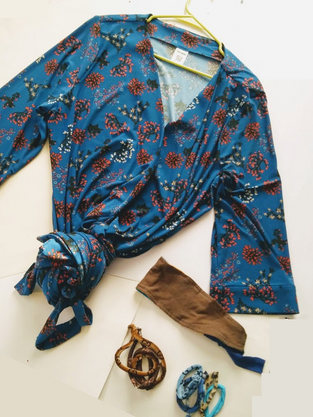 This knee-length, sassy, teal blue, floral wrap dress shows off my curves and a little skin with the 3/4 length sleeves. I like to wear this with black or brown knee-high boots, so I accessorized with brown and blue c.HAIR.i.TEE® headbands and hair ties-as-wristbands.